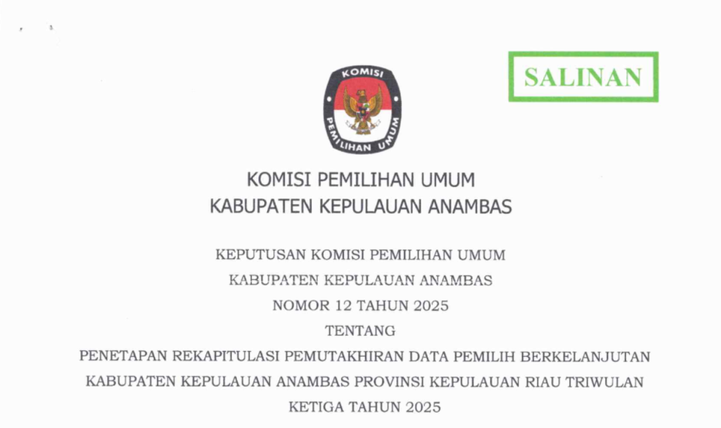 Memperhatikan ketentuan pada Peraturan Komisi Pemilihan Umum Nomor 1 Tahun 2025 tentang Pemutakhiran Data Pemilih Berkelanjutan dan Surat Dinas Komisi Pemilihan Umum Nomor 1577/PP.05-SD/13/2025, Tanggal 10 September 2025, Perihal Persiapan Penyusunan Rekapitulasi PDPB Triwulan III Tahun 2025, bersama ini KPU Kabupaten Kepulauan Anambas mengumumkan Hasil Rekapitulasi Pemutakhiran Data Pemilih Berkelanjutan Triwulan Ketiga Tahun 2025 untuk mendapatkan masukan dan tanggapan dari masyarakat. Pemutakhiran Data Pemilih Berkelanjutan yang selanjutnya disingkat PDPB adalah kegiatan untuk memperbaharui Data Pemilih berdasarkan DPT Pemilu atau Pemilihan terakhir dan telah disinkronisasikan dengan data kependudukan secara nasional termasuk luar negeri. PDPB bertujuan untuk: memelihara dan memperbaharui DPT Pemilu dan/atau Pemilihan terakhir secara berkelanjutan untuk penyusunan DPT pada Pemilu dan/atau Pemilihan berikutnya dengan tetap menjamin kerahasiaan data; menyediakan data dan informasi Pemilih berskala nasional mengenai Data Pemilih secara komprehensif, akurat, dan mutakhir. Diharapkan kepada masyarakat agar dapat memberikan masukan dan tanggapan (Form Masukan dan Tanggapan sebagaimana terlampir) terhadap Daftar Pemilih Berkelanjutan yang diumumkan ini. Masukan dan tanggapan terdiri dari : Pengumuman SK PDPB Triwulan Ketiga Tahun 2025 : SK Lengkap ....