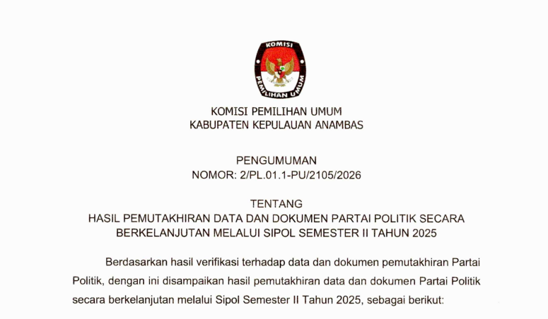 PENGUMUMAN TENTANG HASIL PEMUTAKHIRAN DATA DAN DOKUMEN PARTAI POLITIK SECARA BERKELANJUTAN MELALUI SIPOL SEMESTER II TAHUN 2025