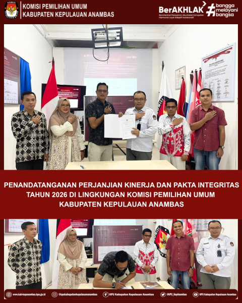 Tarempa, 26 Januari 2026—Komisi Pemilihan Umum Kabupaten Kepulauan Anambas melaksanakan kegiatan Penandatanganan Perjanjian Kinerja dan Pakta Integritas yang diikuti oleh Ketua, Anggota, Sekretaris, pejabat struktural, serta seluruh jajaran Sekretariat KPU Kabupaten Kepulauan Anambas. Kegiatan tersebut berlangsung di Rumah Pintar Pemilu KPU Kabupaten Kepulauan Anambas. Penandatanganan Perjanjian Kinerja dan Pakta Integritas tersebut disaksikan langsung oleh Ketua, Anggota, dan Sekretaris KPU Kabupaten Kepulauan Anambas, serta seluruh jajaran Sekretariat. Kegiatan tersebut merupakan wujud komitmen bersama dalam memperkuat integritas, profesionalisme, dan akuntabilitas dalam penyelenggaraan kelembagaan KPU Kabupaten Kepulauan Anambas. Melalui penandatanganan tersebut, seluruh jajaran KPU Kabupaten Kepulauan Anambas menyatakan kesiapan untuk melaksanakan tugas dan fungsi sesuai dengan ketentuan peraturan perundang-undangan, serta menjunjung tinggi nilai kejujuran, tanggung jawab, dan transparansi dalam setiap tahapan kerja. Kegiatan tersebut diharapkan dapat menjadi landasan moral dan etika bagi seluruh aparatur KPU Kabupaten Kepulauan Anambas dalam memberikan pelayanan terbaik kepada masyarakat serta menjaga kepercayaan publik terhadap lembaga penyelenggara pemilu. ....
