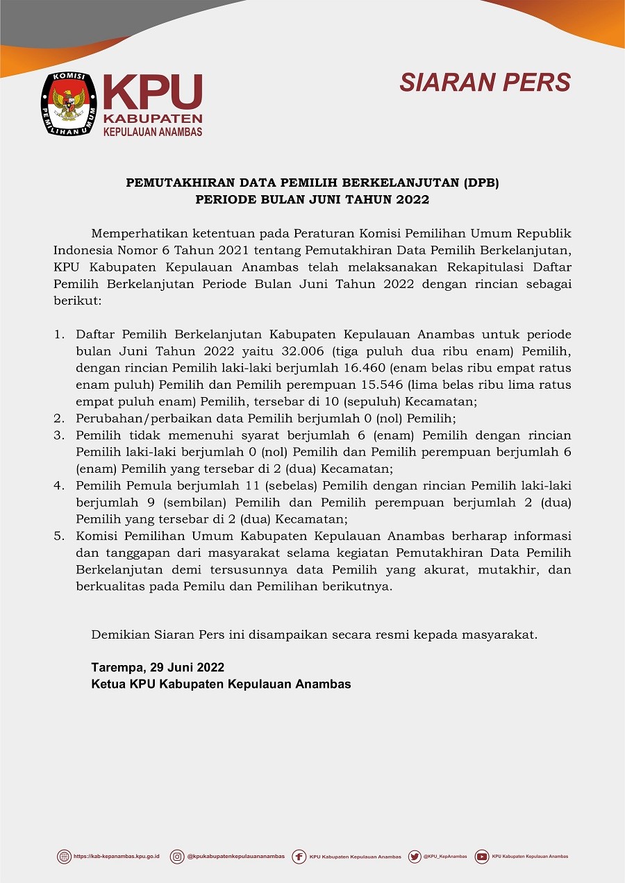 Berikut Siaran Pers PDPB Bulan Juni Tahun 2022 KPU Kabupaten Kepulauan Anambas: