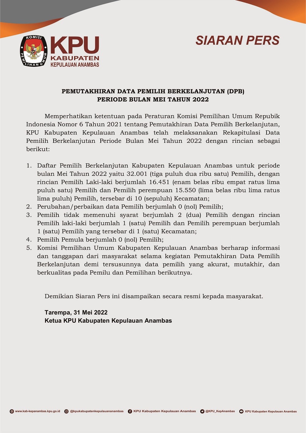Berikut Siaran Pers PDPB Bulan Mei Tahun 2022 KPU Kabupaten Kepulauan Anambas: