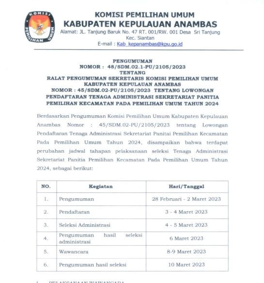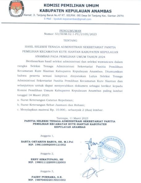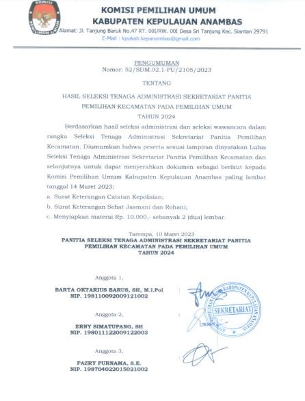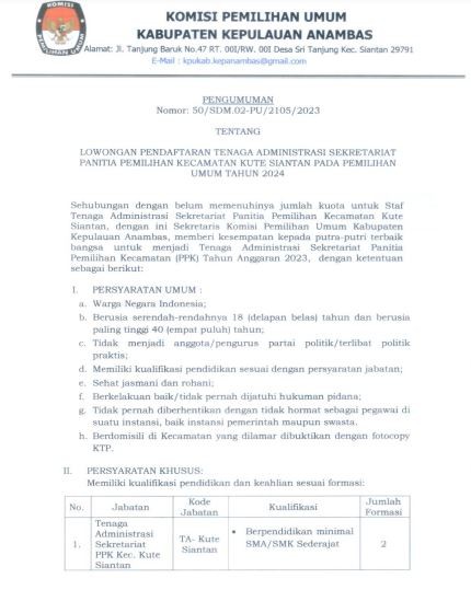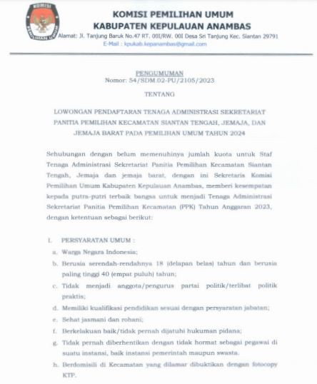 Sehubungan dengan belum memenuhinya jumlah kuota untuk Staf Tenaga Administrasi Sekretariat Panitia Pemilihan Kecamatan Siantan Tengah, Jemaja dan Jemaja Barat, dengan ini Sekretaris Komisi Pemilihan Umum Kabupaten Kepulauan Anambas, memberi kesempatan kepada putra-putri terbaik bangsa untuk menjadi Tenaga Administrasi Sekretariat Panitia Pemilihan Kecamatan (PPK) Tahun Anggaran 2023, dengan ketentuan sebagai berikut: I. PERSYARATAN UMUM : a. Warga Negara Indonesia; b. Berusia serendah-rendahnya 18 (delapan belas) tahun dan berusia paling tinggi 40 (empat puluh) tahun; c. Tidak menjadi anggota/pengurus partai politik/terlibat politik praktis; d. Memiliki kualifikasi pendidikan sesuai dengan persyaratan jabatan; e. Sehat jasmani dan rohani; f. Berkelakuan baik/tidak pernah dijatuhi hukuman pidana; g. Tidak pernah diberhentikan dengan tidak hormat sebagai pegawai di suatu instansi, baik instansi pemerintah maupun swasta. h. Berdomisili di Kecamatan yang dilamar dibuktikan dengan fotocopy KTP. Pengumuman lengkap dalam dilihat / di-download pada link berikut : [ PENGUMUMAN Nomor: 54/SDM.02-PU/2105/2023 ]