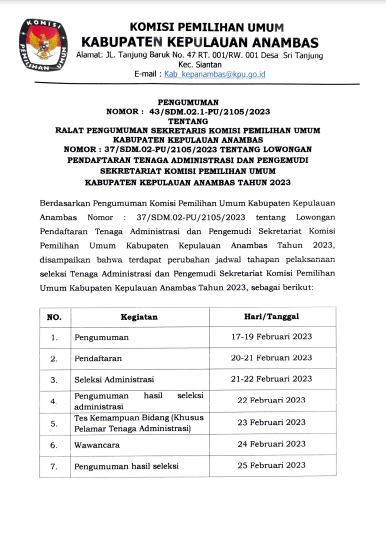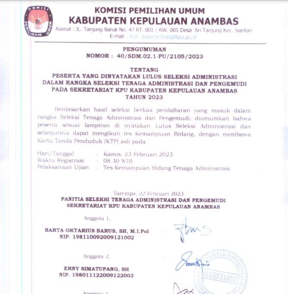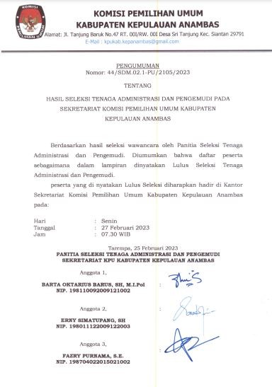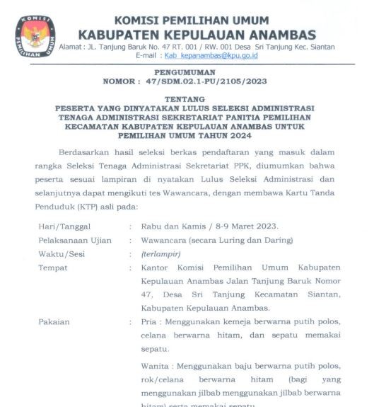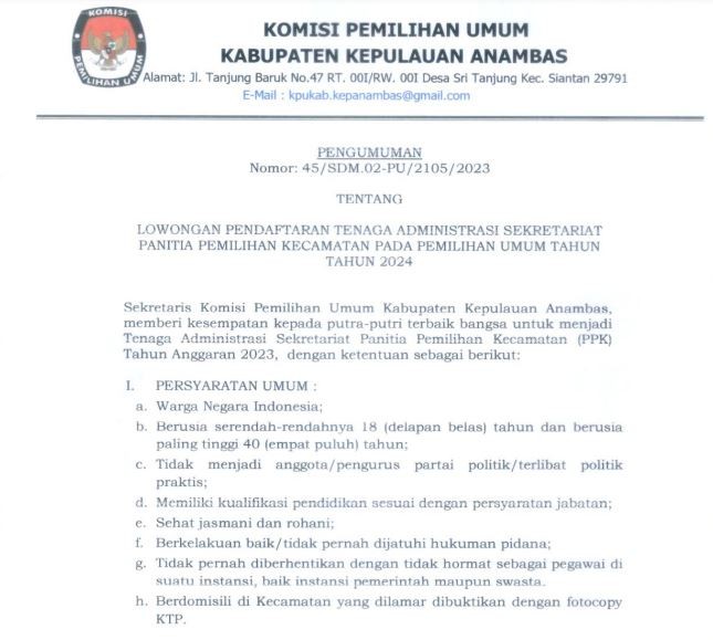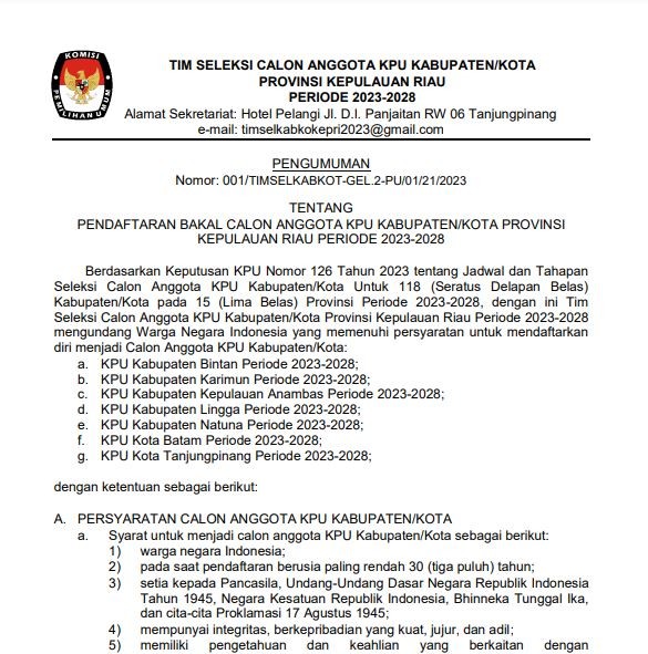Berdasarkan Keputusan KPU Nomor 126 Tahun 2023 tentang Jadwal dan Tahapann Seleksi Calon Anggota KPU Kabupaten/Kota Untuk 118 (Seratus Delapan Belas) Kabupaten/Kota pada 15 (Lima Belas) Provinsi Periode 2023-2028, dengan ini Tim Seleksi Calon Anggota KPU Kabupaten/Kota Provinsi Kepulauan Riau Periode 2023-2028 mengundang Warga Negara Indonesia yang memenuhi persyaratan untuk mendaftarkan diri menjadi Calon Anggota KPU Kabupaten/Kota: a. KPU Kabupaten Bintan Periode 2023-2028; b. KPU Kabupaten Karimun Periode 2023-2028; c. KPU Kabupaten Kepulauan Anambas Periode 2023-2028; d. KPU Kabupaten Lingga Periode 2023-2028; e. KPU Kabupaten Natuna Periode 2023-2028; f. KPU Kota Batam Periode 2023-2028; g. KPU Kota Tanjungpinang Periode 2023-2028; dengan ketentuan sebagai berikut: A. PERSYARATAN CALON ANGGOTA KPU KABUPATEN/KOTA a. Syarat untuk menjadi calon anggota KPU Kabupaten/Kota sebagai berikut: 1) warga negara Indonesia; 2) pada saat pendaftaran berusia paling rendah 30 (tiga puluh) tahun; 3) setia kepada Pancasila, Undang-Undang Dasar Negara Republik Indonesia Tahun 1945, Negara Kesatuan Republik Indonesia, Bhinneka Tunggal Ika, dan cita-cita Proklamasi 17 Agustus 1945; 4) mempunyai integritas, berkepribadian yang kuat, jujur, dan adil; 5) memiliki pengetahuan dan keahlian yang berkaitan dengan penyelenggaraan Pemilu, ketatanegaraan, dan kepartaian; 6) berpendidikan paling rendah sekolah menengah atas atau sederajat; 7) berdomisili di wilayah Kabupaten/Kota Provinsi Kepulauan Riau yang dibuktikan dengan kartu tanda penduduk elektronik; 8) mampu secara jasmani, rohani, dan bebas dari penyalahgunaan narkotika; 9) mengundurkan diri dari keanggotaan partai politik sekurang-kurangnya 5 (lima) tahun pada saat mendaftar sebagai calon; 10) mengundurkan diri dari jabatan politik, jabatan di pemerintahan, dan/atau badan usaha milik negara/badan usaha milik daerah pada saat mendaftar sebagai calon; 11) bersedia mengundurkan diri dari kepengurusan organisasi kemasyarakatan yang berbadan hukum dan tidak berbadan hukum apabila telah terpilih menjadi anggota KPU Kabupaten/Kota, yang dibuktikan dengan surat pernyataan; 12) tidak pernah dipidana penjara berdasarkan putusan pengadilan yang telah memperoleh kekuatan hukum tetap karena melakukan tindak pidana yang diancam dengan pidana penjara 5 (lima) tahun atau lebih; 13) bersedia bekerja penuh waktu, yang dibuktikan dengan surat pernyataan; 14) bersedia tidak menduduki jabatan politik, jabatan di pemerintahan, dan/atau badan usaha milik negara/badan usaha milik daerah selama masa keanggotaan apabila terpilih; dan 15) tidak berada dalam ikatan perkawinan dengan sesama Penyelenggara Pemilu. b. Selain persyaratan sebagaimana dimaksud pada huruf a, calon anggota KPU Kabupaten/Kota harus memenuhi syarat belum pernah menjabat sebagai anggota KPU Kabupaten/Kota selama 2 (dua) kali masa jabatan dalam jabatan yang sama. c. Penghitungan 2 (dua) kali masa jabatan sebagaimana dimaksud pada huruf b dihitung berdasarkan jumlah pelantikan dalam jabatan yang sama selama 5 (lima) tahun atau lebih dari 2½ (dua setengah) tahun pada setiap masa jabatan. d. Penghitungan 2 (dua) kali masa jabatan sebagaimana dimaksud pada huruf c, meliputi: 1) telah 2 (dua) kali berturut-turut dalam jabatan yang sama; 2) telah 2 (dua) kali dalam jabatan yang sama tidak berturut-turut; atau 3) telah 2 (dua) kali dalam jabatan yang sama di daerah yang sama atau di daerah yang berbeda. e. Selain persyaratan sebagaimana dimaksud pada huruf a, calon anggota KPU Kabupaten/Kota harus memenuhi syarat tidak pernah dikenai Sanksi Pemberhentian tetap dari Dewan Kehormatan Penyelenggara Pemilu. B. KELENGKAPAN DOKUMEN PERSYARATAN Berkas persyaratan calon anggota KPU Kabupaten/Kota terdiri atas: a. surat pendaftaran yang ditandatangani di atas bermeterai cukup yang dibuatmenggunakan formulir MODEL SURAT PENDAFTARAN-CALON; b. fotokopi kartu tanda penduduk elektronik; c. pas foto berwarna terbaru 6 (enam) bulan terakhir berukuran 4 x 6 cm (empat kali enam sentimeter) sebanyak 1 (satu) lembar untuk ditempel di formulir MODEL DAFTAR.RIWAYAT.HIDUP-CALON; d. daftar riwayat hidup yang dibuat menggunakan formulir MODEL DAFTAR.RIWAYAT.HIDUP-CALON; e. fotokopi ijazah pendidikan terakhir yang dilegalisasi oleh satuan pendidikan yang menerbitkan ijazah atau dilakukan oleh instansi yang berwenang sesuai dengan ketentuan perundang-undangan; f. surat pernyataan yang ditandatangani di atas meterai cukup, yang menyatakan: 1) setia kepada Pancasila, Undang-Undang Dasar Negara Republik Indonesia Tahun 1945, Negara Kesatuan Republik Indonesia, Bhinneka Tunggal Ika, dan cita-cita Proklamasi 17 Agustus 1945 yang dibuat dengan formulir MODEL SURAT.PERNYATAAN.1-CALON; 2) tidak pernah menjadi anggota partai politik dalam jangka waktu paling singkat 5 (lima) tahun pada saat mendaftar sebagai calon anggota KPU Provinsi dan KPU Kabupaten/Kota yang dibuat dengan formulir MODEL SURAT.PERNYATAAN.2-CALON; 3) bersedia bekerja sepenuh waktu dan tidak bekerja pada profesi lainnya selama masa keanggotaan yang dibuat dengan formulir MODEL SURAT.PERNYATAAN.3-CALON; 4) bersedia tidak menduduki jabatan politik, jabatan di pemerintahan dan/atau badan usaha milik negara/badan usaha milik daerah selama masa keanggotaan yang dibuat dengan formulir MODEL SURAT.PERNYATAAN.4-CALON; 5) bersedia mengundurkan diri dari kepengurusan organisasi kemasyarakatan yang berbadan hukum dan tidak berbadan hukum apabila terpilih menjadi anggota KPU Provinsi dan KPU Kabupaten/Kota yang dibuat dengan formulir MODEL SURAT.PERNYATAAN.5-CALON; 6) tidak berada dalam ikatan perkawinan dengan sesama Penyelenggara Pemilu yang dibuat dengan formulir MODEL SURAT.PERNYATAAN.6- CALON; dan 7) belum pernah menjabat selama 2 (dua) kali masa jabatan dalam jabatan yang sama bagi calon anggota KPU Provinsi dan/atau KPU Kabupaten/Kota yang pernah menjabat sebagai anggota KPU Provinsi atau KPU Kabupaten/Kota yang dibuat dengan formulir MODEL SURAT.PERNYATAAN.7-CALON; g. surat keputusan pem