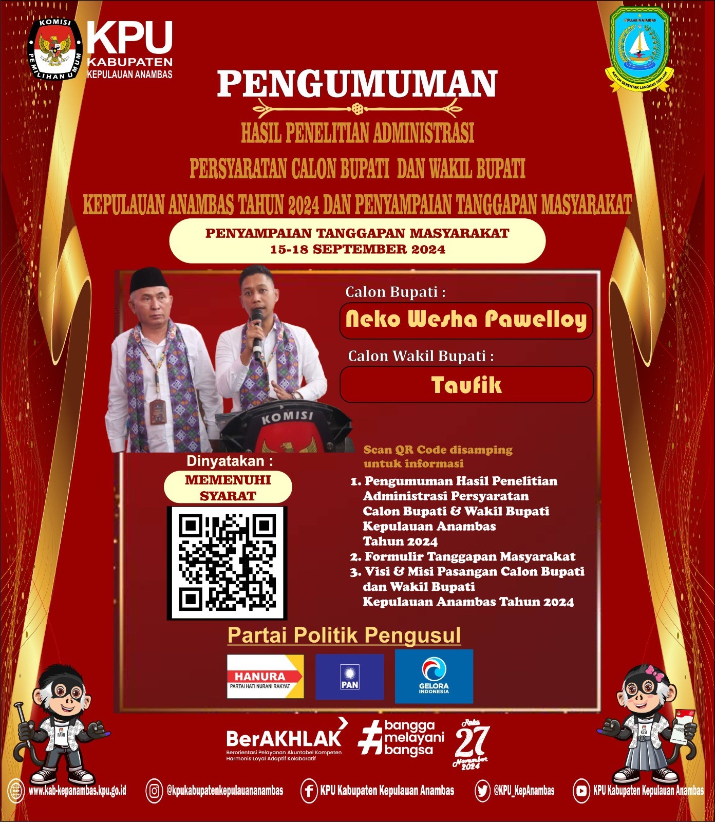 Berikut kami sampaikan nama-nama Tim Kampanye Pemilihan Bupati dan Wakil Bupati Kabupaten Kepulauan Anambas Tahun 2024: