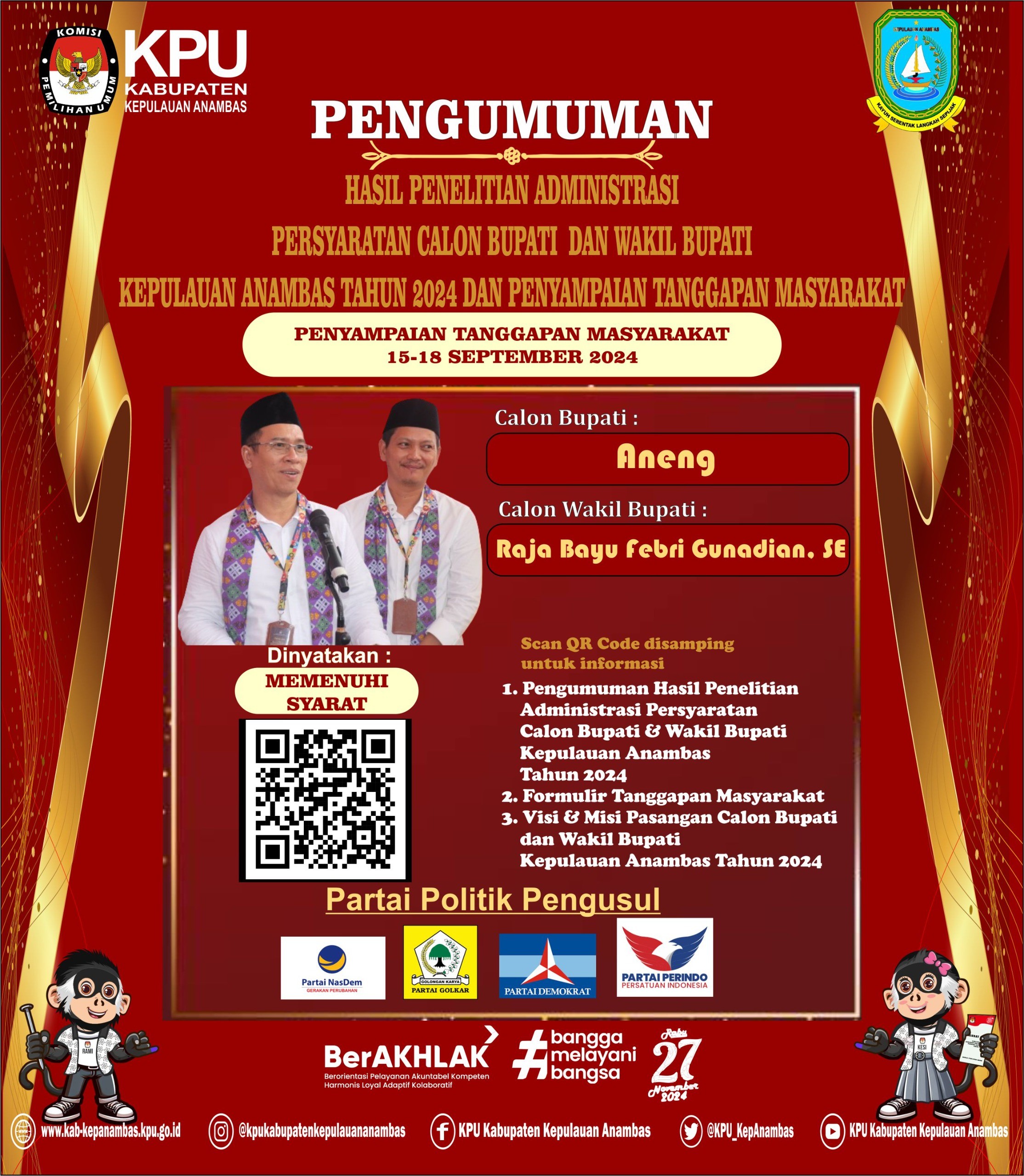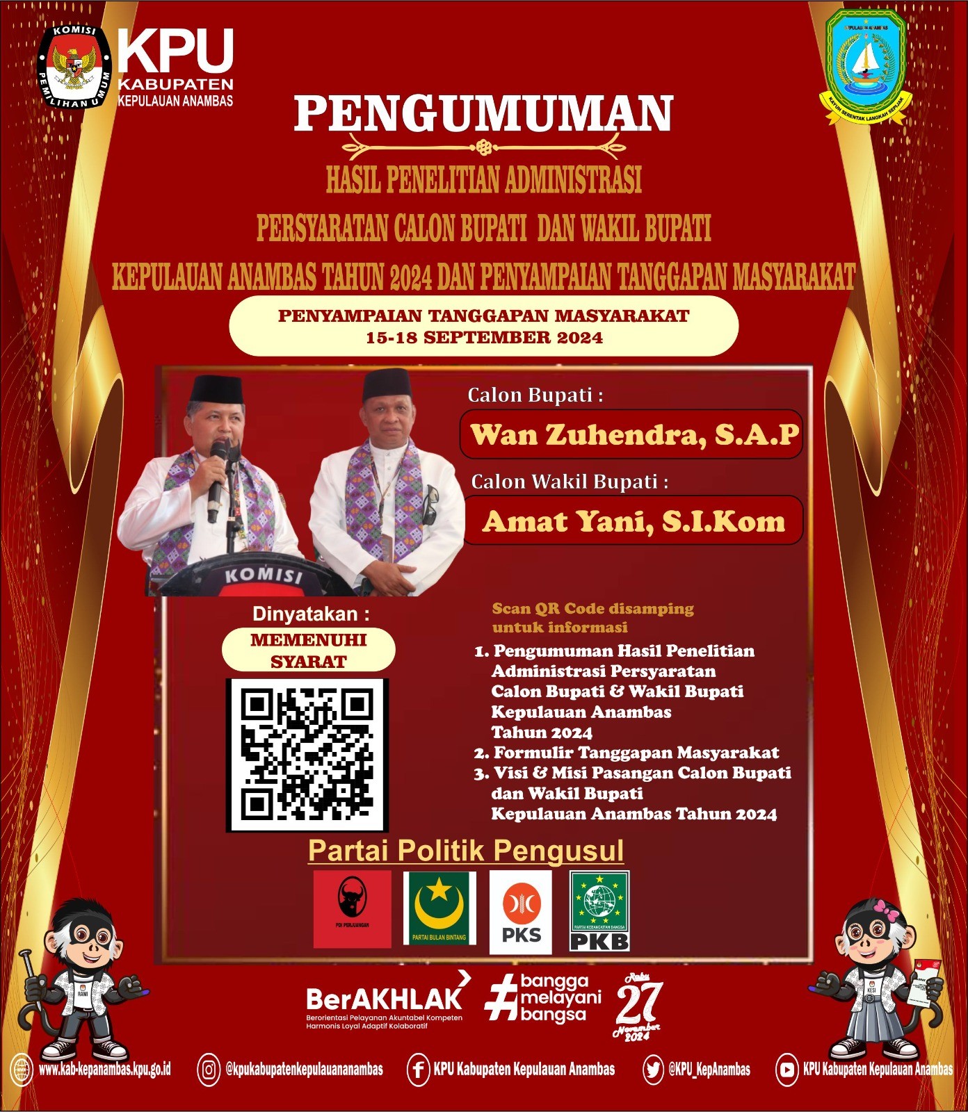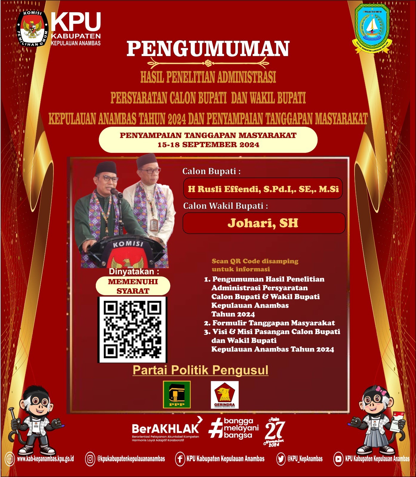 Bahwa Untuk Menyampaikan Informasi Penerimaan, Visi dan Misi serta Program Pasangan Calon Bupati dan Wakil Bupati Kepulauan Anambas Tahun 2024 Kepada Masyarakat. Komisi Pemilihan Umum Kabupaten Kepulauan Anambas Menyampaikan Visi dan Misi serta Program Pasangan Calon Bupati dan Wakil Bupati Kepulauan Anambas H. Rusli Effendi, S.Pd.I,. SE,. M.Si dan Johari, S.H